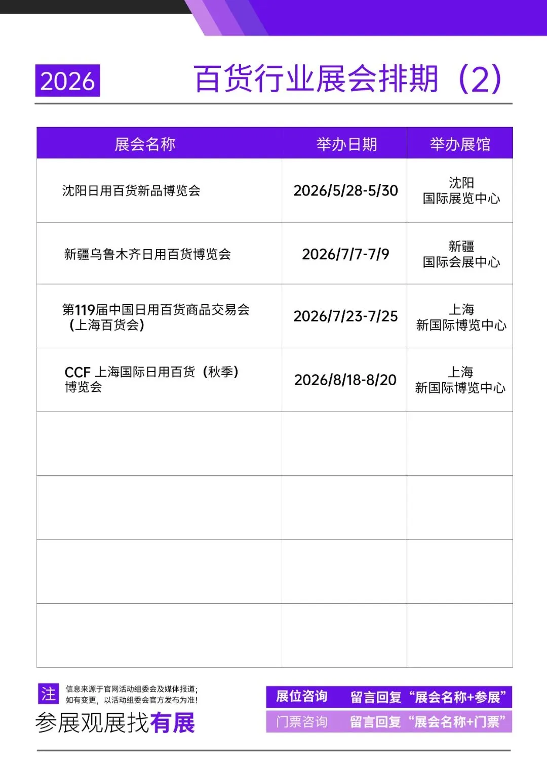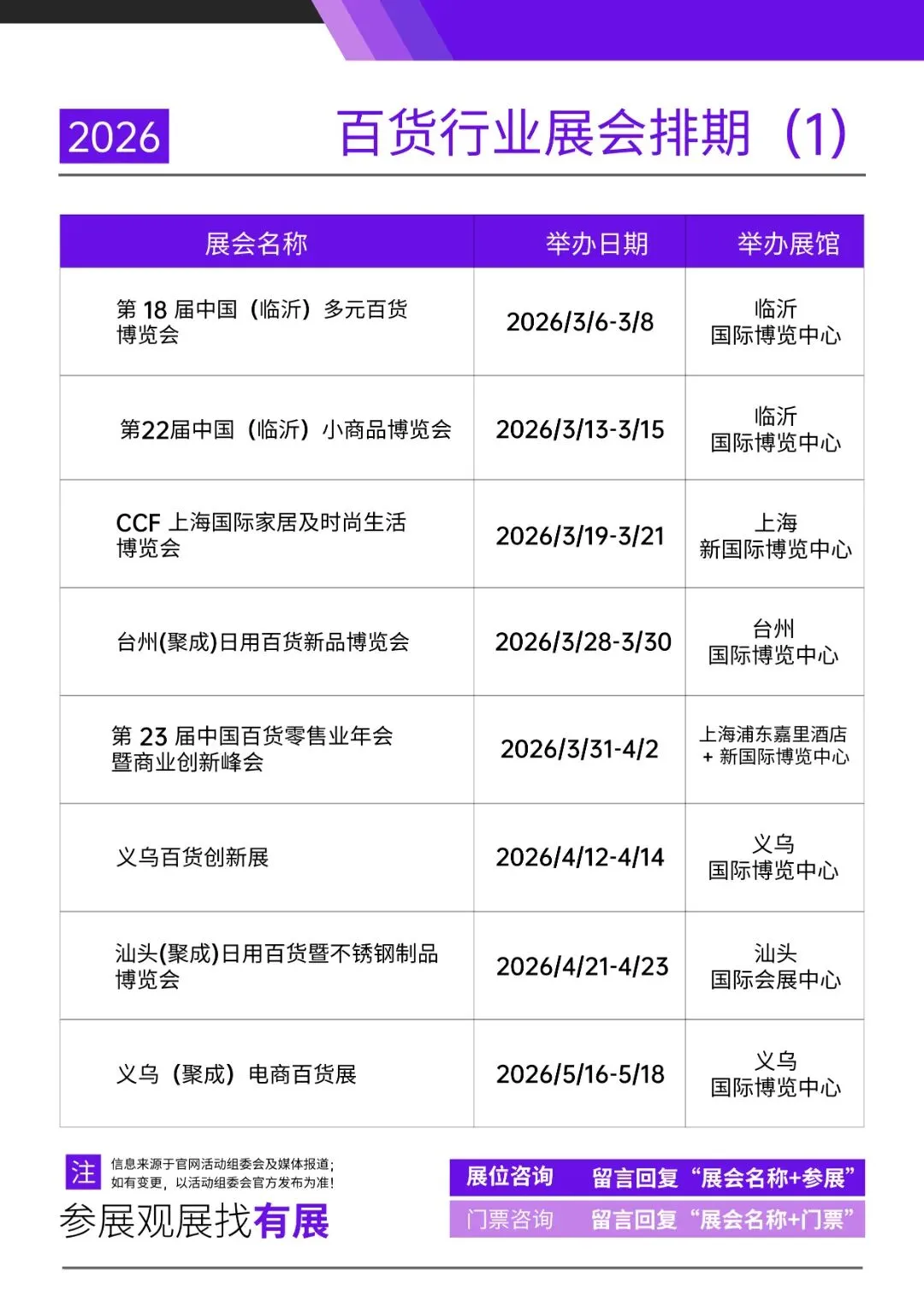 声明:展会排期信息来源于百货行业展官网、公众号、活动组委会及媒体报道,展会时间、地点、规模等细节可能因主办方调整发生变化,具体以主办方最新公告为准。以上为有展网为大家整理的百货行业展会排期,希望能为各位提供部分参考。