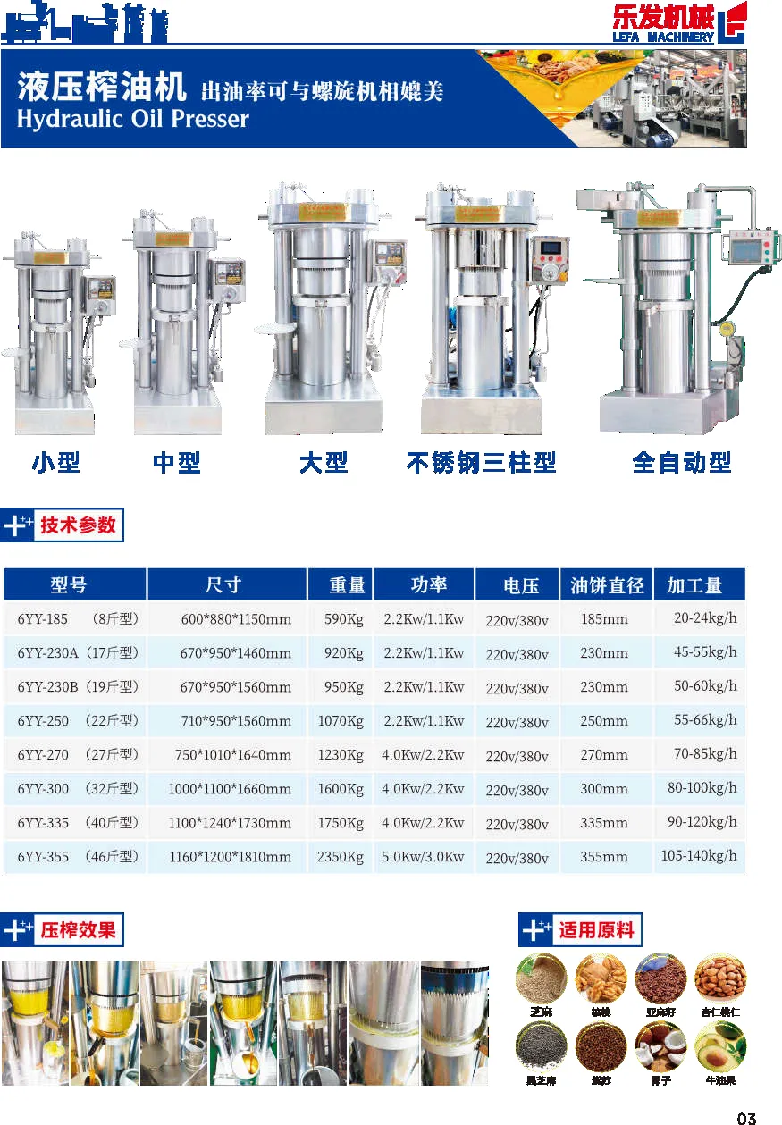 液压榨油机可广泛应用于压榨多种油料;产品质量、性能、生产效率均居行业同类产品前茅,具有科技含量高、设计合理、质量可靠、操作简单、占地少、省工、省电等优点。其加工生产的各种油品产量高,油质好。6YY-8斤型、6YY-17斤型、6YY-19斤型、6YY-22斤型、6YY-27斤型、6YY-32斤型、6YY-40斤型、6YY-46斤型 精炼油设备的参与可以改变油品的色泽,让成品油品质更加金黄剔透、纯正。其次,可以改善油品的风味,让得到的成品油更适合消费者的口味。之后,精炼油设备参与后很重要的一点是可以让成品油储藏很长一段时间,在食用期间油品不会变质,也可以用来直接供应商超。型号:300公斤精炼,500公斤精炼,一吨,二吨,三吨......等等根据客户需求都可以定制。