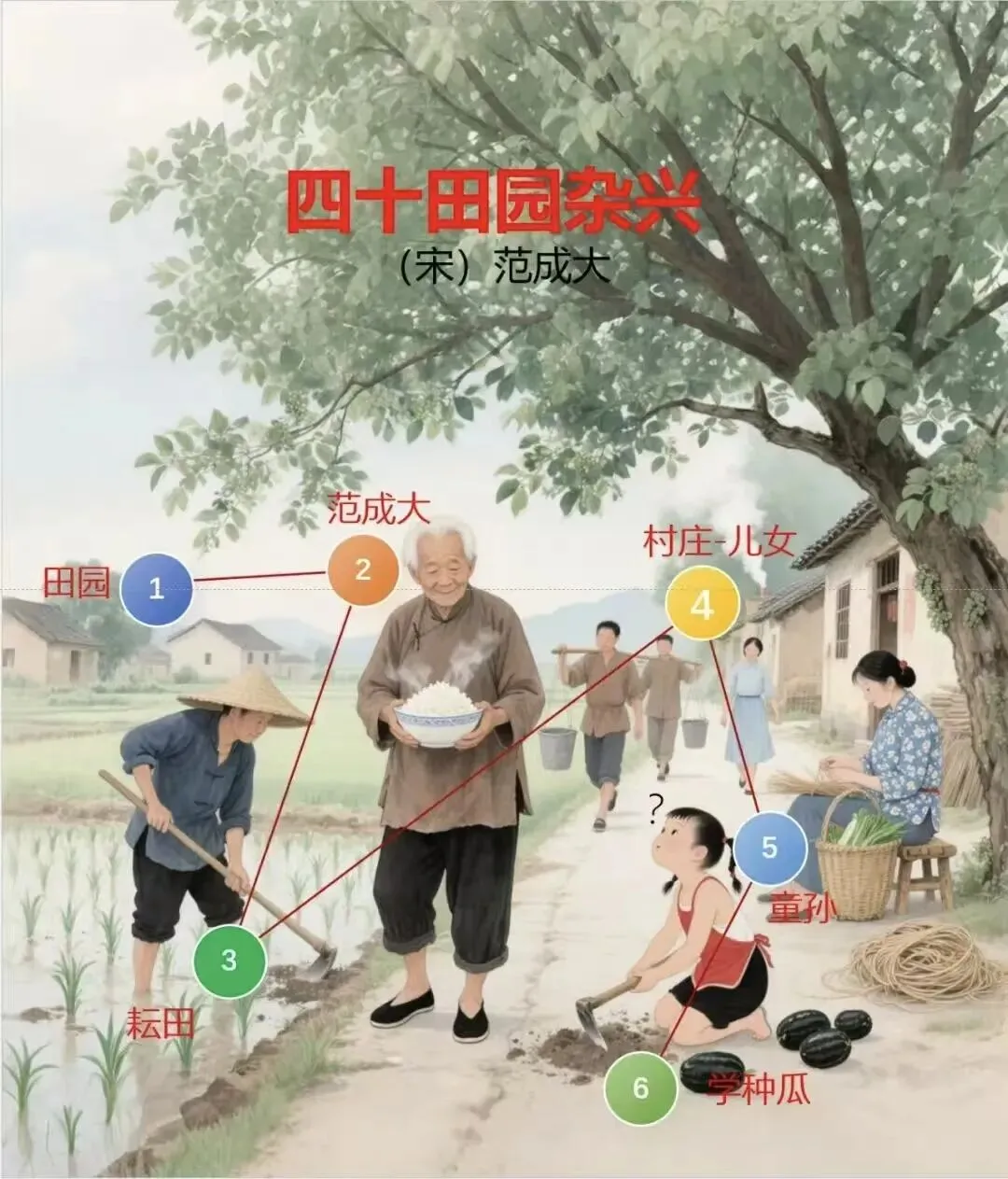 《四时田园杂兴》:“耘田”“绩麻”——大人的忙碌;“也”——孩子的模仿