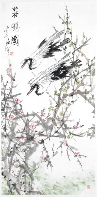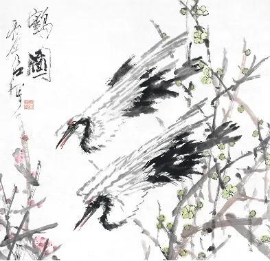 虚谷笔下的仙鹤造型打破了写实的束缚,进行了大胆的简括与变形。墨色浓淡对比强烈,翅羽以泼墨挥扫,头颈却以细笔轻勾,动静相生间将鹤的灵动与孤傲刻画得入木三分,赋予了画面一种巧妙的视觉张力。