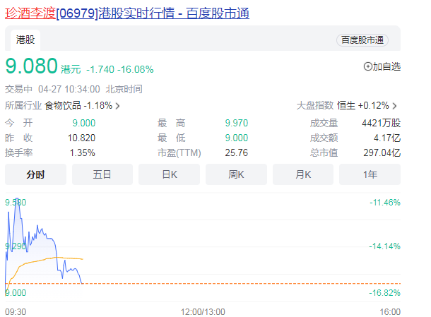 4月27日,珍酒李渡在港交所成功上市,发行价为10.82港元/股,这是时隔七年后,中国资本市场迎来的又一个酒企“新成员”。不过上市首日,珍酒李渡开盘价9港元,低开破发跌16.8%。