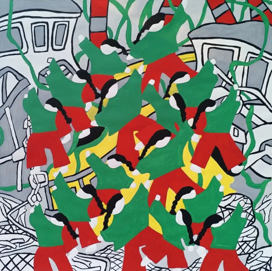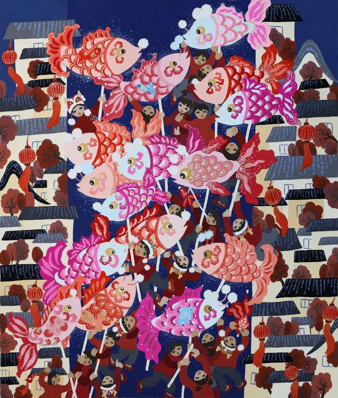中国农民画并非“横空出世”。它深植于剪纸、刺绣、皮影、雕刻、年画等民间母体艺术,是稻麦气息与手工温度的当代延伸。20 世纪 50 年代,江苏邳县(今邳州市)、河北束鹿(今辛集市)、陕西户县(今西安鄠邑区)等地率先把“拿锄头的手”引向纸面,由此掀起一场持续数十年的农民画浪潮。红高粱、金麦浪、鸡鸣犬吠、袅袅炊烟……从未进过美院的作者,以朴拙之形、炽热之色,记录下乡土中国的呼吸与心跳。