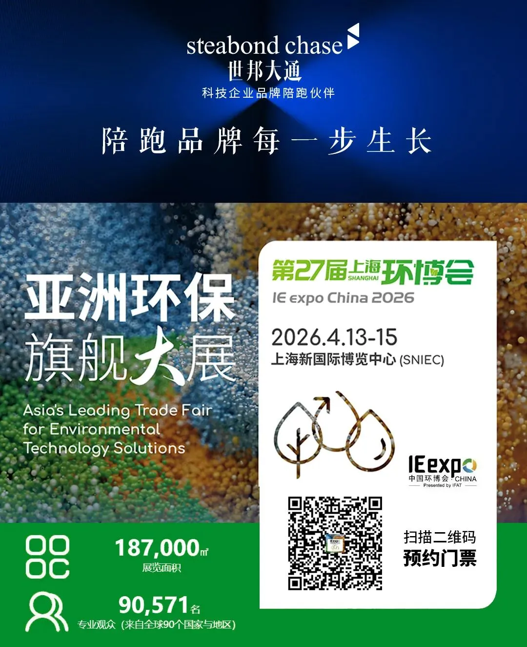 上海环博会(IE expo)作为慕尼黑IFAT环保展旗下在中国举办的环保产业盛会,深耕中国环保产业26年,已发展成为仅次于母展的全球第二大环保展,将于2026年4月13-15日在上海新国际博览中心再度举办。