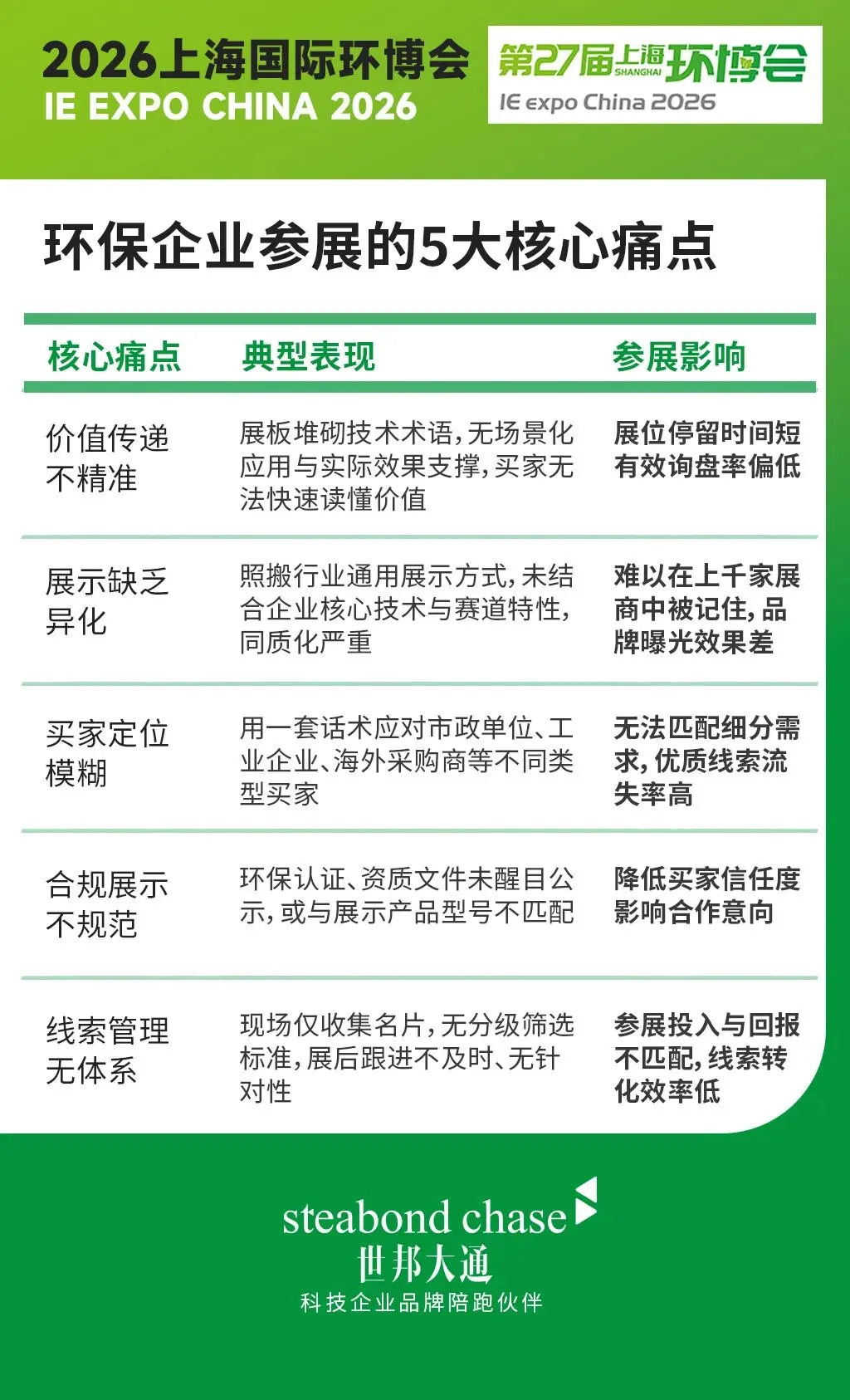世邦大通深耕工业展会营销多年,紧扣 2026 上海环博会智能化、低碳化、资源化、国际化四大核心趋势,为环保企业量身打造模块化、可组合的参展解决方案。以专业策略助力企业在环博会中实现 “品牌专业度提升 + 有效线索沉淀”的双重目标
