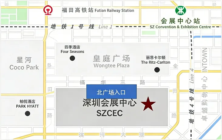 地铁:1号线/4号线「会展中心站」D出口,步行150米直达北广场入口;