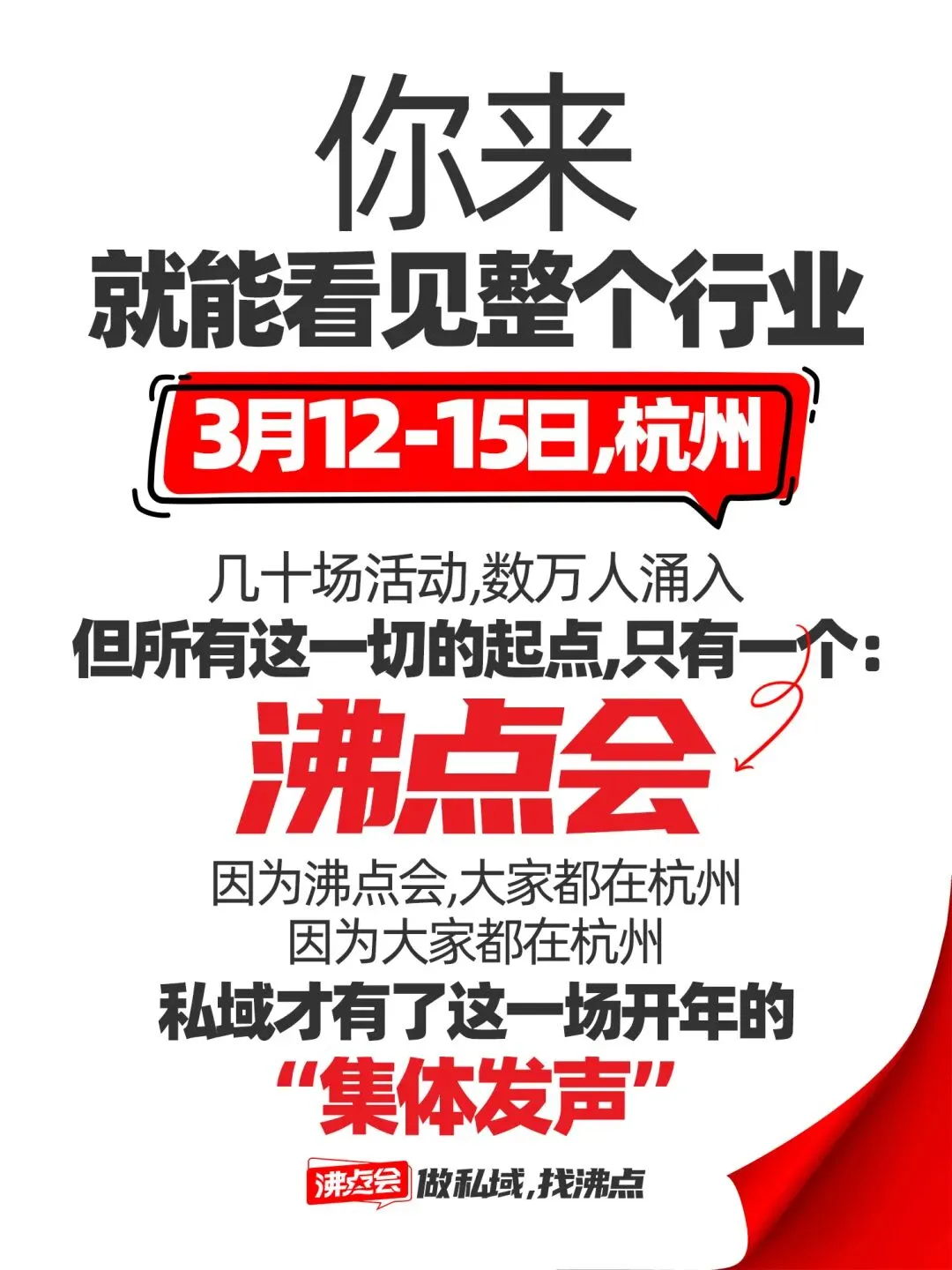 一、活动概要- 展会名称:第30届沸点会暨杭州私域爆品供应链展/万人私域选品大会- 主题:开年选爆品,就来沸点会- 时间:2026年3月12–15日(论坛+展览+闭门对接)- 地点:杭州国际博览中心- 规模:5大展馆|50000㎡|1000+展商|10000+爆品|万人专业观众- 主办:沸点会展(广州)有限公司- 定位:私域开年第一展、头部渠道聚集地、全品类高效选品平台