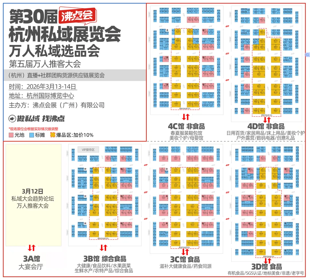 1. 3月12日(周四)|趋势论坛私域趋势峰会(1500人规模)2. 3月13–14日(周五–周六)|核心展览全馆展示、选品对接、现场洽谈3. 3月15日(周日)|百强渠道闭门对接会、头部渠道定向匹配三、展馆规划(5大主题馆)- 3B馆:食品生鲜、酒水饮料、休闲零食、粮油调味- 3C馆:大健康滋补、药食同源、保健食品、有机认证- 3D馆:地方特产、地标美食、非遗老字号、农特产品- 3A馆:美妆个护、服饰鞋包、母婴童装、家居百货- 4楼馆:日用百货、厨卫小家电、户外露营、创意礼品