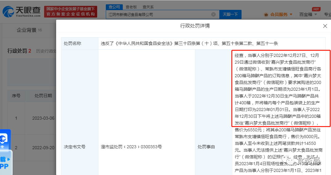 处罚事由显示,该公司收到400箱马蹄酥产品订购信息,其中一商行要求其购进的200箱马蹄酥产品的生产日期须为2023年1月1日。该公司于2022年12月30日生产马蹄酥产品共计400箱,并将产品包装袋上的生产日期打印为2023年1月1日。在市监局现场检查后,该公司对上述涉案产品进行了召回,未能实际召回产品,亦未接到消费者不良反应。