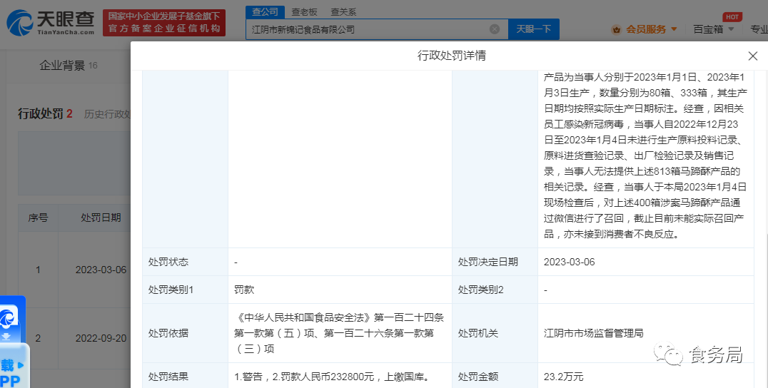 近日,江阴市新锦记食品有限公司因违反食品安全法,被江阴市市场监督管理局罚款23.28万元。