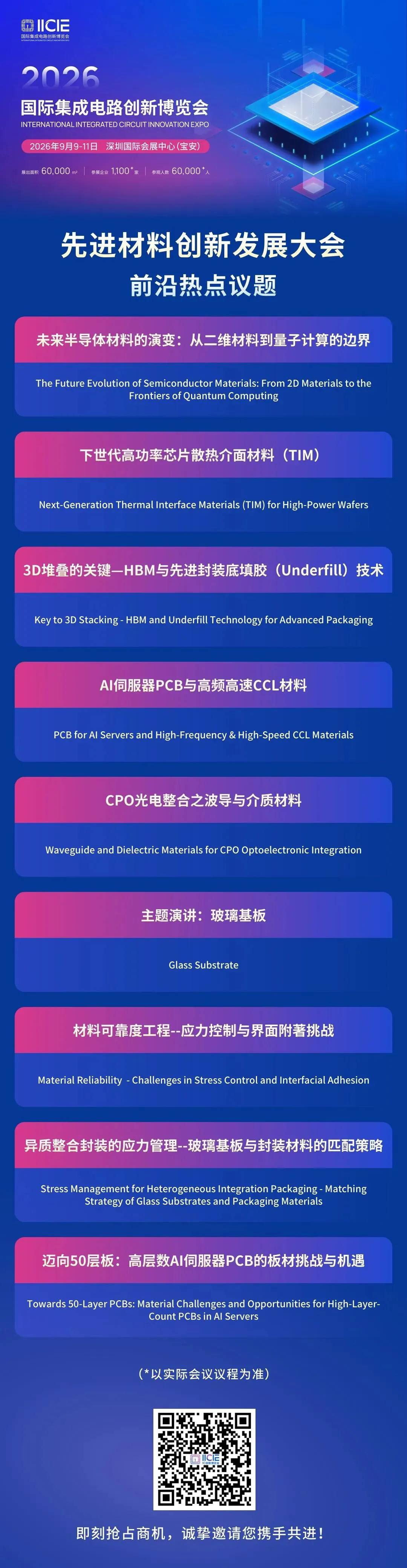 我们诚挚邀请您参与本次先进材料创新发展大会,与全球行业精英齐聚深圳,共探AI算力时代先进材料的创新路径,破解异质整合封装核心难题,携手共筑集成电路特色芯生态,共绘产业高质量发展新蓝图!