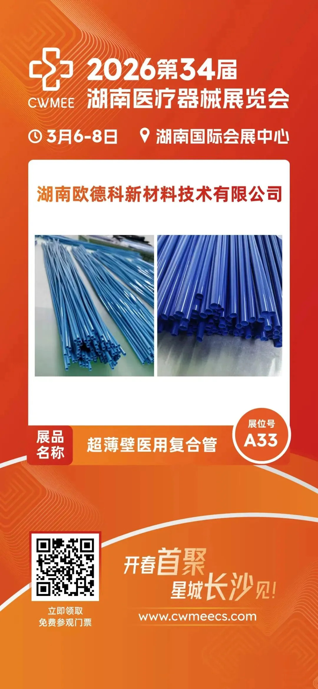 开春首聚,星城长沙见!2026第34届湖南医疗器械展览会(CWMEE)即将盛大启幕,湖南欧德科新材料技术有限公司将携核心展品超薄壁医用复合管重磅亮相,与行业同仁共话医用高分子精密导管的创新与发展。? 核心展品抢先看:超薄壁医用复合管