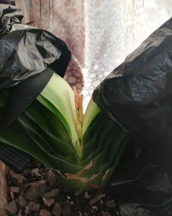 一,发现君子兰有夹箭倾向时就将君子兰盆栽放入阴凉的小黑屋遮光,下图就是夹箭倾向的君子兰了。