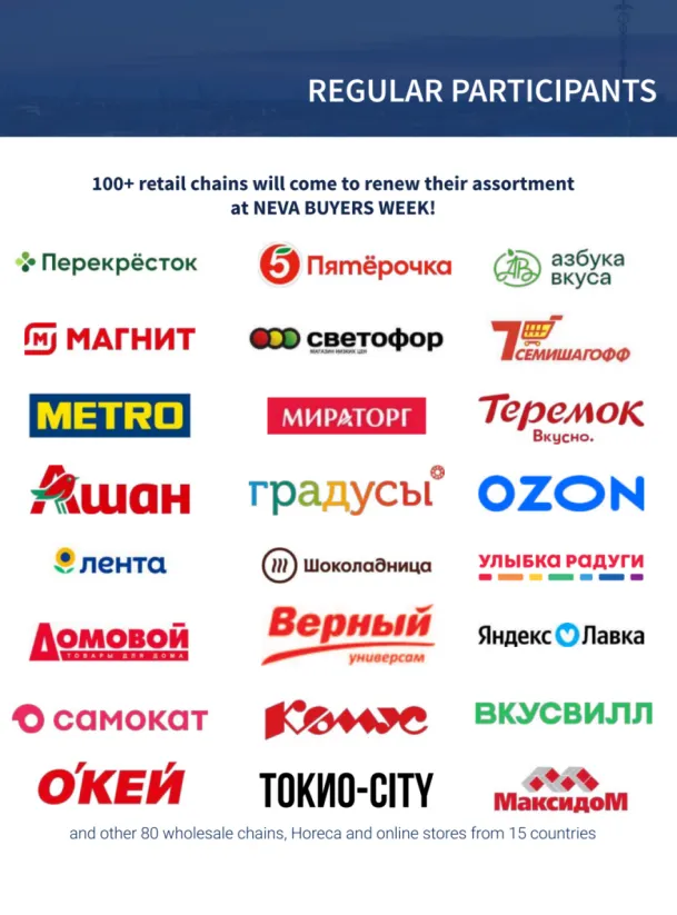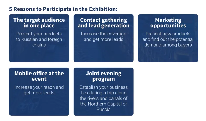 集合食品和非食品产品的制造商和供应商的连锁零售和HoReCa的展览会,3000名顶尖高管、CEO及商务总监将齐聚圣彼得堡,开展高效洽谈,分享前沿商业理念,与来自不同地区和国家的同行建立并拓展业务联系。展会上您可以向零售及酒店餐饮行业的核心采购负责人展示您的产品,将您的产品推向全俄罗斯的商店货架,更新您的客户数据库,并与新客户建立直接联系!