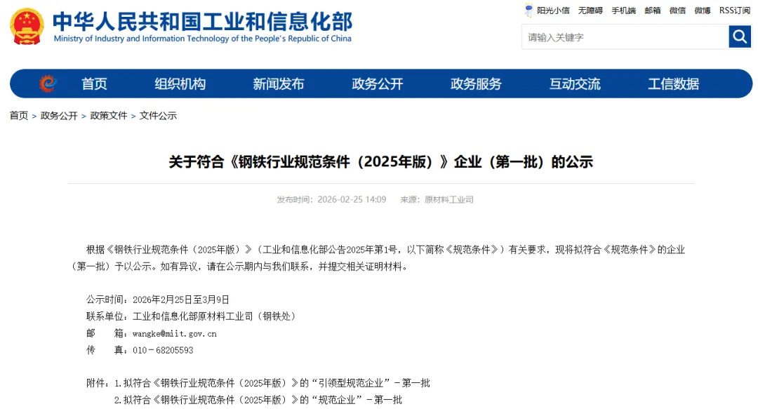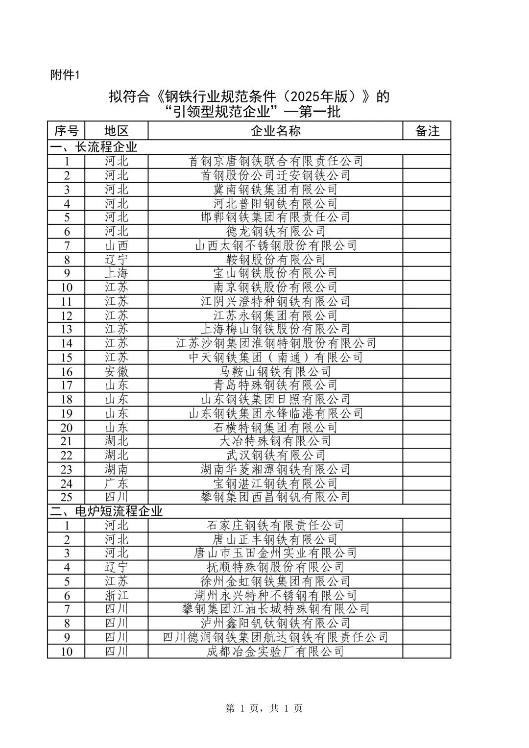 根据《钢铁行业规范条件(2025年版)》(工业和信息化部公告2025年第1号,以下简称《规范条件》)有关要求,现将拟符合《规范条件》的企业(第一批)予以公示。如有异议,请在公示期内与我们联系,并提交相关证明材料。