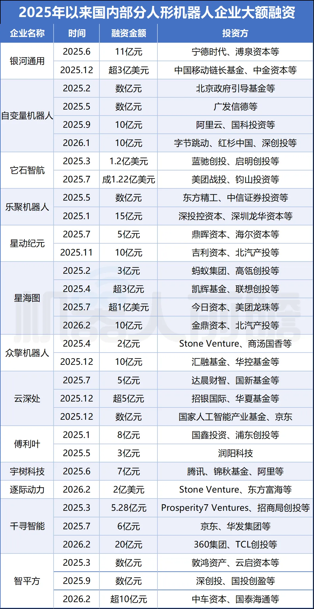 ▲2025年以来,中国部分人形机器人企业大额融资情况统计