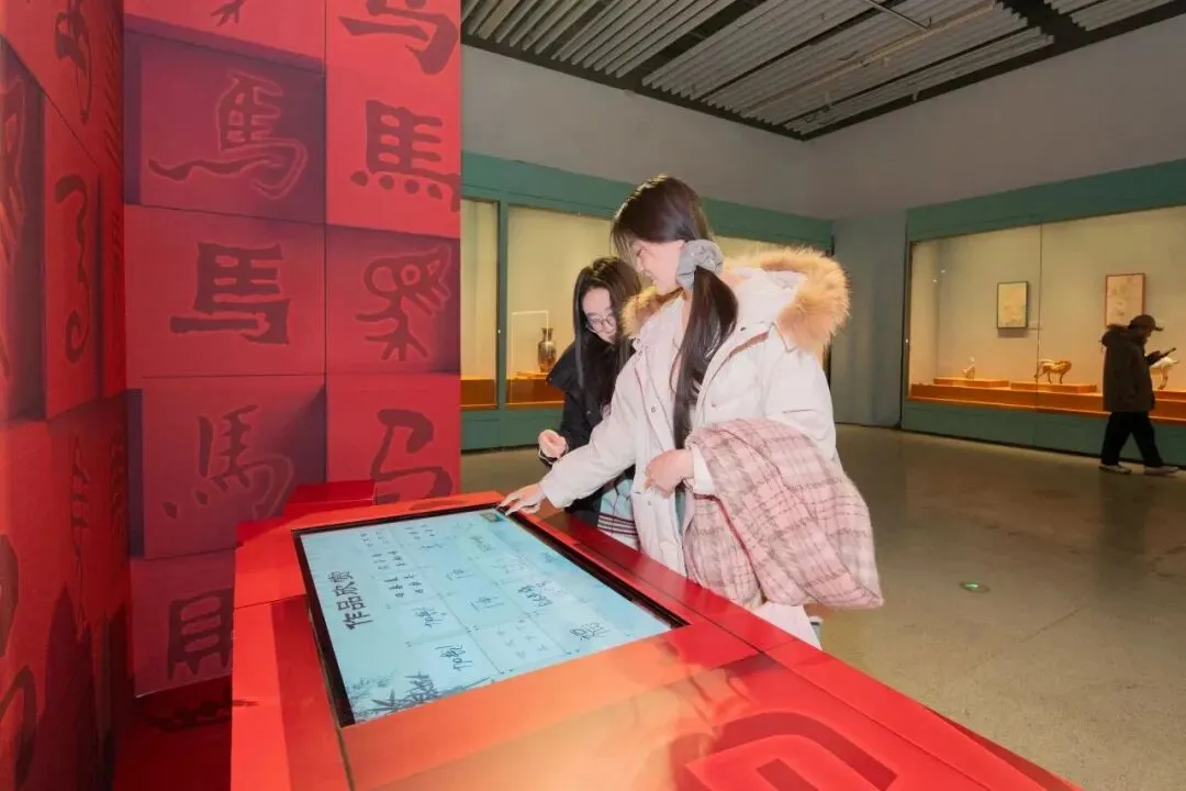 展览纵览马在中华文明长卷中的千姿百态,汇集与马相关的珍贵文物,勾勒中国历史悠久的马文化,汉代画像砖上身姿矫健的马纹、唐代红陶马见证的盛世气象、明清书画中兼工带写的骏马神韵……它们不仅是艺术的结晶,更是历史深处马蹄声的实物回响。本次展陈设计更注重互动设计与沉浸体验,为观众打造丰富体验。观众可在展厅中通过互动书法桌,了解“马”的汉字流变,在不同点位体验集章乐趣,带着对“马”文化的好奇心,在展厅寻迹中深度解读马的文化内涵。