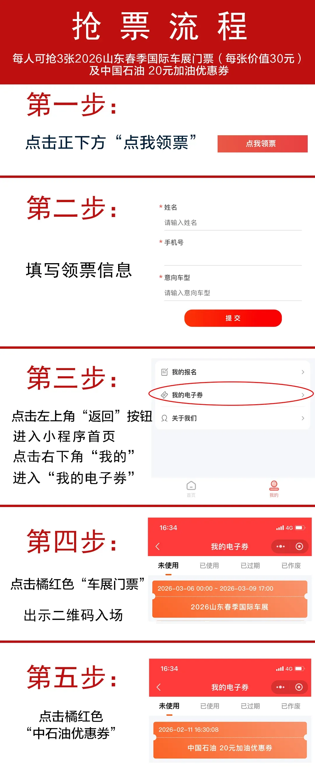 点击页面下方的“点我领票”,然后再进行简单的操作,即可免费获取2026山东春季国际车展门票三张,价值90元,以及两张中国石油20元加油优惠券,总的惊喜金额达到130元。
