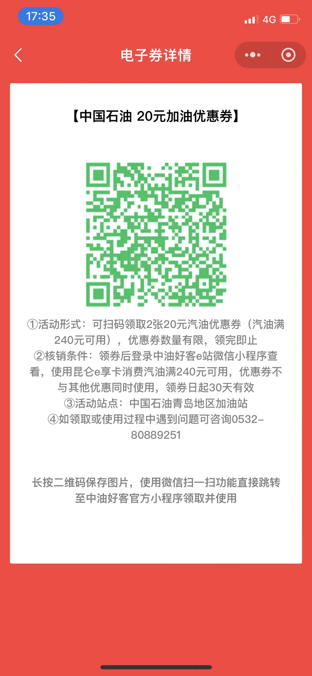 活动形式:可扫码领取2张中国石油20元加油优惠券(汽油满240元可用),优惠券数量有限,领完即止