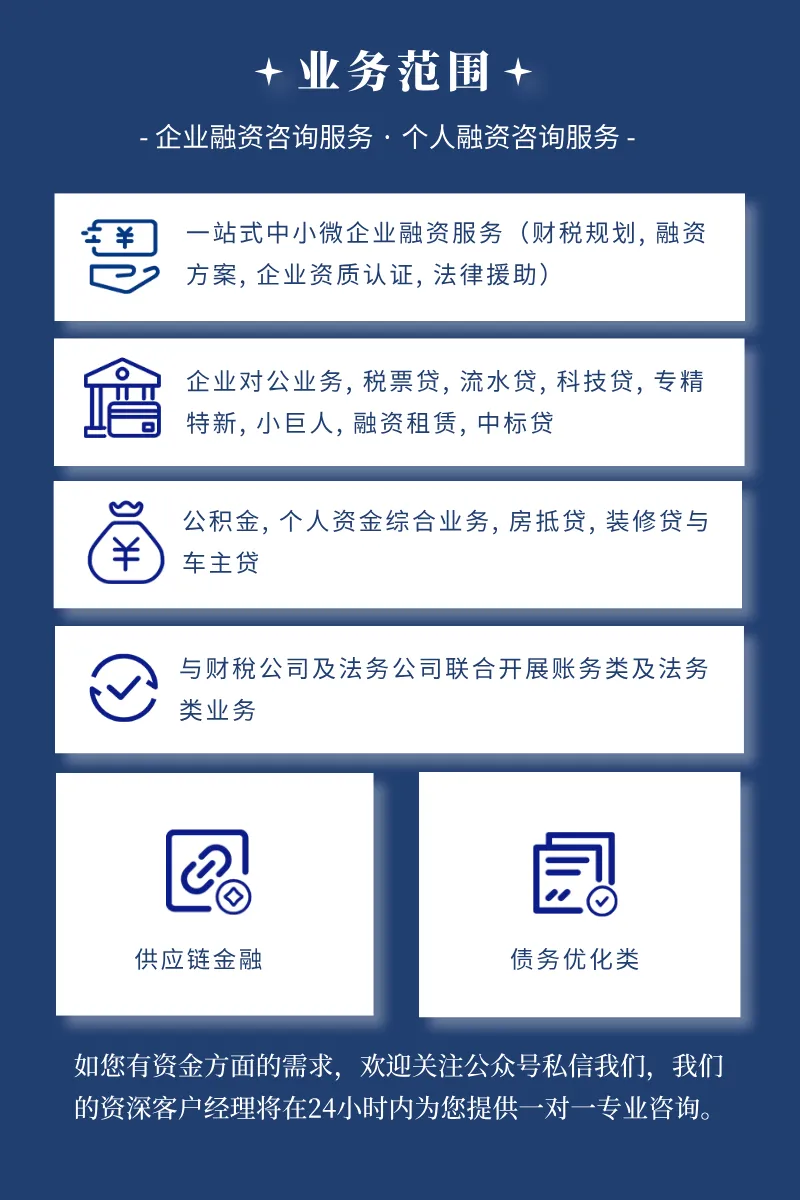 帮你融一站式企业服务平台,能够根据客户情况快速匹配适合的贷款方案,从19年至今,我们累计给超10000组客户提供咨询服务,服务客户4000➕人次,积累了大量实操经验,可以更好解决客户需求,服务范围:企业融资、个人消费贷、债务重组、过桥续贷、工商财税、企业信用修复、工商注册、公司变更注销、记账报税、资质许可、税务筹划等专业顾问全程跟办,助您快速解决资金以及经营难题。