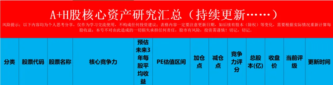 我对华明装备的看法放在专栏本文前面,其他优秀公司的看法和平时的交易操作计划,也在专栏里,公司的估值请参考专栏里这个《A+H股核心资产研究汇总》表。