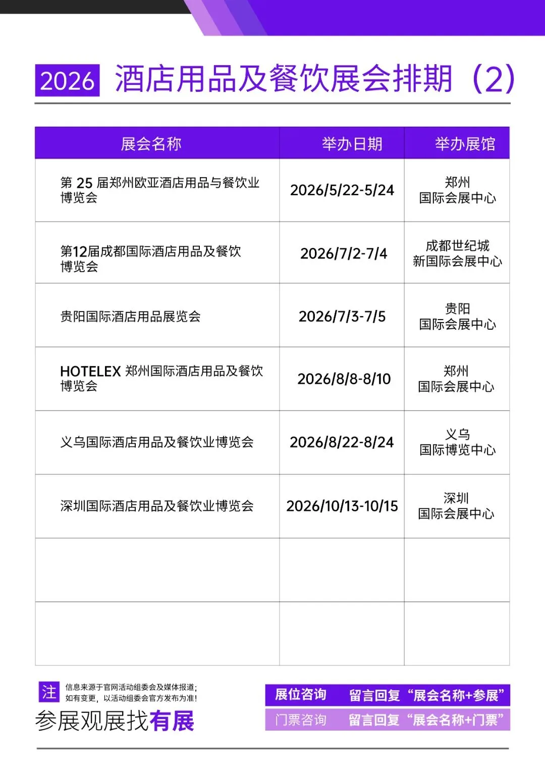声明:展会排期信息来源于酒店用品及餐饮展官网、公众号、活动组委会及媒体报道,展会时间、地点、规模等细节可能因主办方调整发生变化,具体以主办方最新公告为准。以上为有展网为大家整理的酒店用品及餐饮展会排期,希望能为各位提供部分参考。