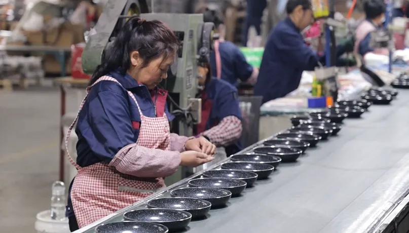 近日,记者走进位于三江街道的楚平锅业生产车间,眼前已是热火朝天,流水线高速运转,工人们各就各位,一只只锃亮的锅具从生产端鱼贯而出。“这批30万只的订单催得急,全是发往欧美的。”公司的生产副总冯合永在车间里扯着嗓子告诉记者。为了赶这批货,大伙儿一直干到年前十二月廿七才放假,正月初六就全员返岗,到初八这天,生产线上已经恢复了春节前的节奏。冯合永给记者算了笔账:仅节前那段时间,企业就赶出了22万多只锅具,日均产量稳定在1.6万只以上。“初八返岗率已经超过五成,初十达到80%。”他说,眼下人手还没完全到位,公司紧急招了一批本地临时工顶上,无论如何得把客户的订单按时交掉。翻看企业的生产计划表,订单已经排到了今年6月。这个势头,让总经理胡楚平既兴奋又有些“甜蜜的烦恼”。“新厂房去年11月底才投用,现在老厂新厂加起来,一天有1.6万只的产能。按目前的订单量,如果场地够用,一天做到2.5万只不成问题。”胡楚平告诉记者,场地成了眼下最迫切的诉求,“要么改造现有厂房,把效率再往上提一提,要么物色一块新场地,继续扩张。”回望来路,胡楚平笑称自己“运气好”。2021年企业刚成立时,只有1万多平方米的老厂房,年产值不过800万元。靠着给国际品牌代工,搭上外贸的快车,企业年产值连续多年保持50%以上的高增长。2025年,随着新厂房投产,年产值一举跃上9000万元台阶。2026年,他的目标很明确:突破两亿元。如今的楚平锅业,外贸占比稳定在60%左右,产品主要销往欧美。30%左右为国内品牌代工。剩下的5%,是胡楚平心里最牵挂的一块,“楚平”这个自主品牌,从去年开始悄悄起步。“目前,我们已经在京东、拼多多等电商平台开设了品牌店铺,锅具类目已经排进前二。”胡楚平拿起一只刚下线的自家品牌炒锅,“我们给国际大牌代工这么多年,质量是有底气的。现在自己做品牌,就是想让中国的老百姓用上物美价廉的好锅。”他坦言,做自主品牌任重道远,但总要迈出这一步。“这是我们楚平的梦想。”