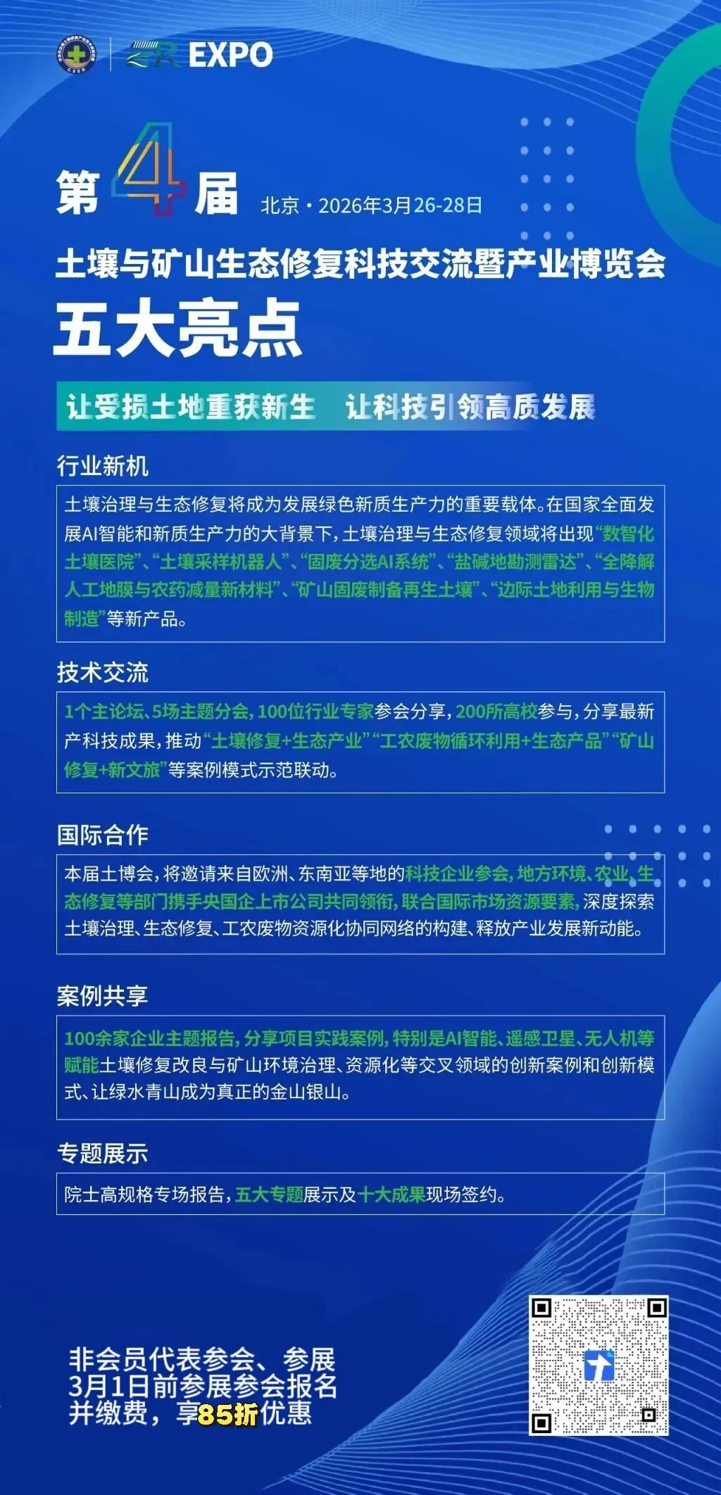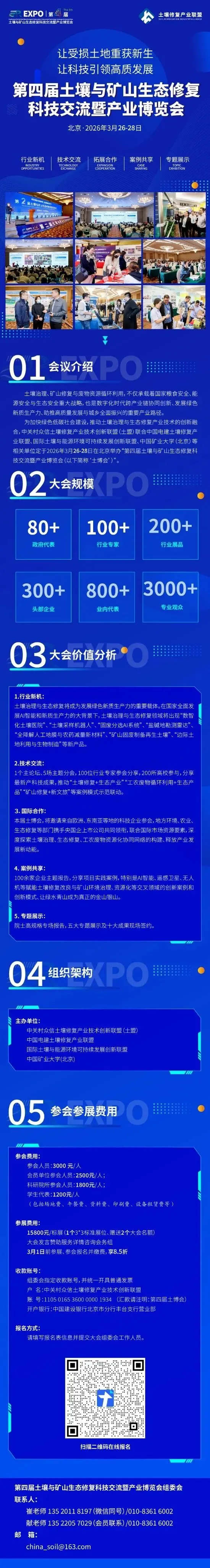 为加快绿色低碳社会建设,推动土壤治理与生态修复产业技术的创新融合,中关村众信土壤修复产业技术创新联盟(土盟)联合中国电建土壤修复产业联盟、国际土壤与能源环境可持续发展创新联盟、中国矿业大学(北京)等相关单位定于2026年3月26-28日在北京举办“第四届土壤与矿山生态修复科技交流暨产业博览会(以下简称‘土博会’)”。