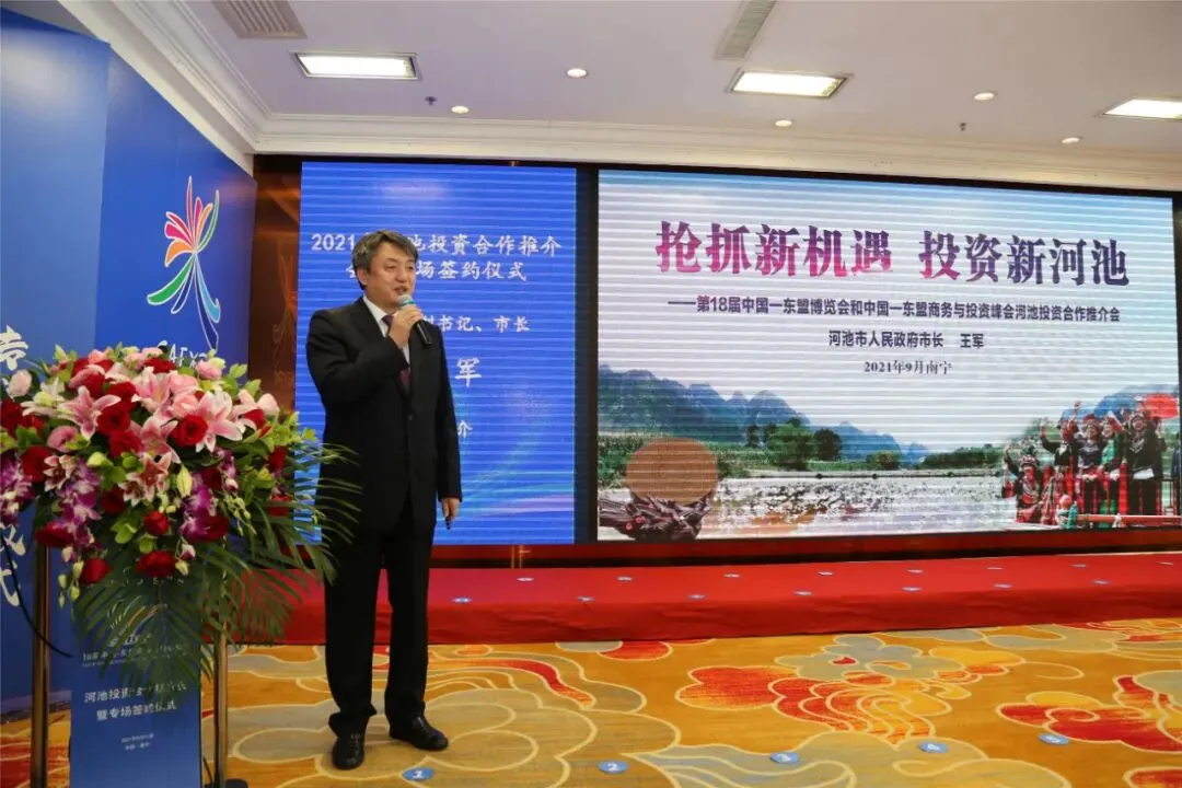 会上,王军作“抢抓新机遇 投资新河池”为主题的招商专题推介,表示河池是一座克难攻坚、赶超跨越、宜居宜业的城市,紧紧围绕“六新河池”主要目标,认真落实“九个聚力、九个推动”工作任务要求,全面参与共建西部陆海新通道,加快建设现代化综合交通运输体系,构建区域协调发展的新型城镇化体系,打造国内一流的营商环境,河池市正迎来重要战略机遇期,希望在有色金属新材料、丝绸全产业链、太阳能电池、新能源、大数据云计算、基础设施建设、大健康等产业展开合作,共同谱写建设新时代中国特色社会主义壮美广西河池篇章。