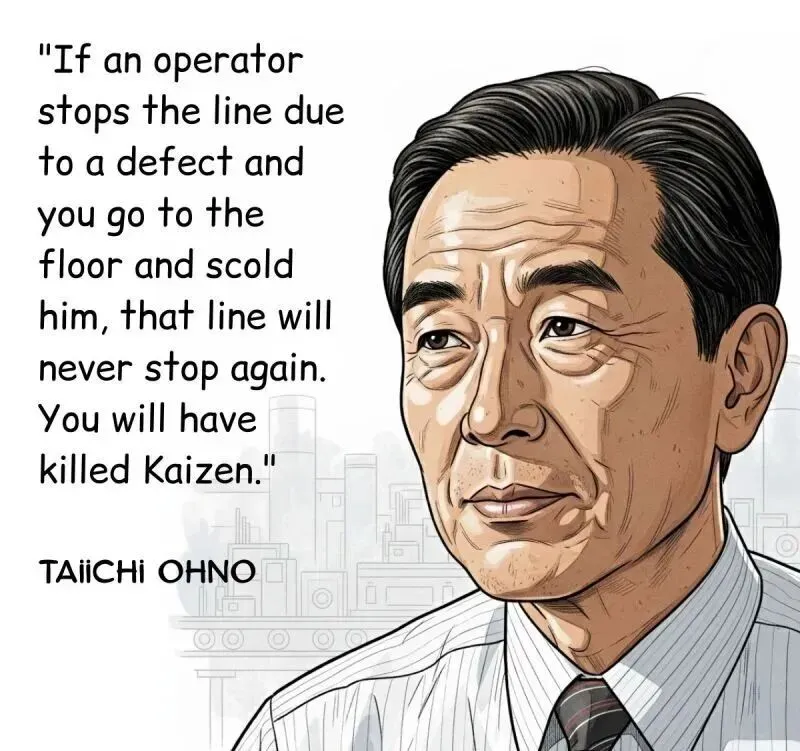 “如果操作工因为发现缺陷而停止了生产线,你却跑过去责备他,那么这条线将再也不会停下来.你,亲手杀死了改善(Kaizen).”-大野耐一