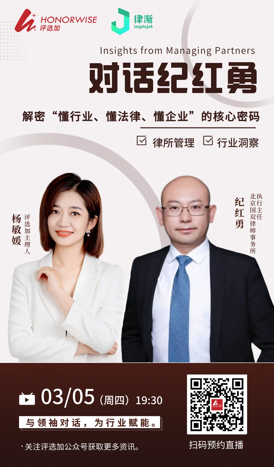 3月5日(周四)19:30,我们特邀重磅嘉宾北京国双律师事务所执行主任纪红勇律师。评选加主理人杨敏媛将与纪律师围绕其20余年跨界从业经历、重大疑难民商事争议解决经验、AI 时代下优秀律师的专业发展路径,以及国双律所发展理念等核心话题,为广大法律从业者带来一场干货满满、极具实务价值的专业分享。