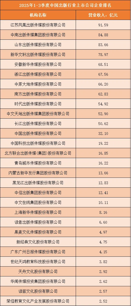 根据申万行业分类,2025年1-3季度中国出版行业上市公司按营业收入排名如下:(A股上市公司)