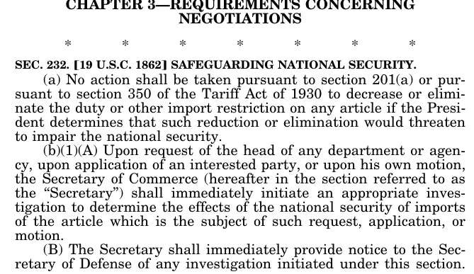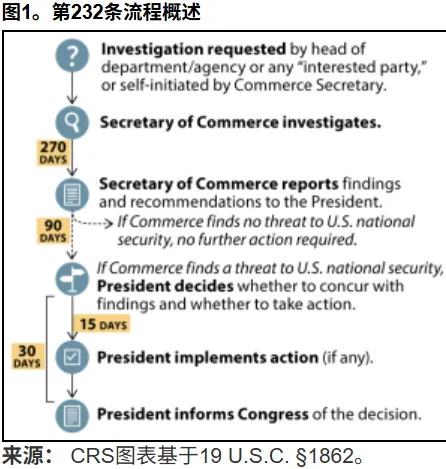 1962年《贸易扩展法》第232条经修订(19 U.S.C. §1862)允许总统在商务部长经调查后认定进口数量或其他情况“威胁”美国国家安全时,对进口商品施加限制或与贸易伙伴谈判。