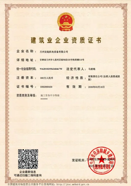 公司持有《特种设备生产许可证》《安全生产许可证》《建筑业企业资质证书》,并通过质量、环境、职业健康安全管理体系认证,集齐全系列行业必备资质。凭借完备的资质保障,公司具备起重机械安装、修理、改造及钢结构工程施工全品类服务能力,可独立承接200吨及以下大型起重机安装工程,在各类起重机械相关工程施工中树立了规范、可靠的良好企业形象。