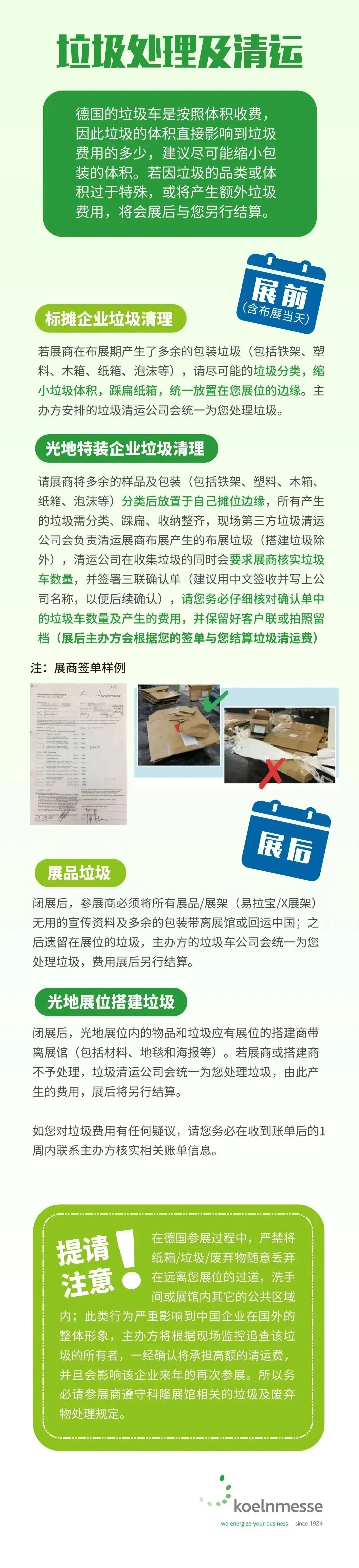 由于组织方面的原因,在展会最后一天下午 5:00 之前不得开始拆除展台。在此之前和整个展会期间,展台必须配备注册和批准的展览材料,并有工作人员看管。在展会结束之前,请不要开始清理展台和包装展品。如有违反,科隆展览有权按照合同规定处以最高 5,000.00 欧元的罚款。