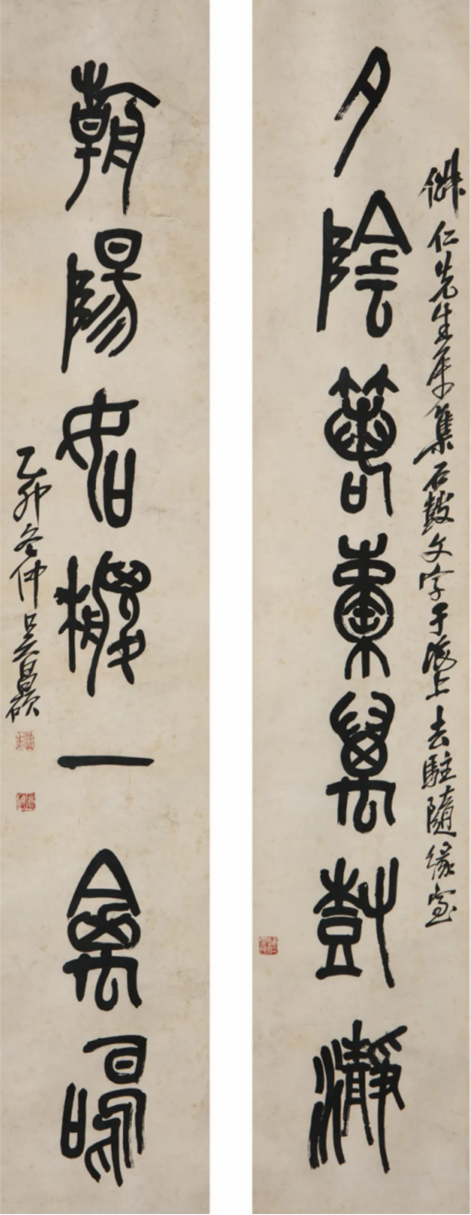 吴昌硕的艺术生涯跨越清末民初的动荡年代,其书法植根于金石学传统,尤以篆书见长,喜将石鼓文集字书写对联。自1911年定居上海后,书法步入晚年的成熟阶段,于古拙之中彰显豪迈之气,将阅尽沧桑的人生感悟化入笔端,内涵更加丰富,做到了人书俱老。