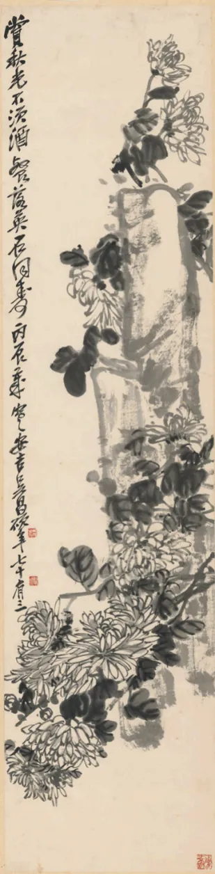 菊花是吴昌硕笔下常见的题材。此次展出的这幅《菊石图》(上海美术馆藏)是吴昌硕晚年的大写意精品之作。作品完全超脱了物象的束缚,以金石书法笔意入画,追求自由畅达的境界。布局章法颇费经营,枝蔓潇洒自如,势如老龙回顾;花叶繁茂,花序如紫蝶成行,虚实相生。落款以石鼓文笔法作行草,笔力浑厚,金石韵味十足。全幅注重用“气”,气之生发、流走,用笔之收放、行止、方圆、正侧,无不关乎气韵,独具大美,豪迈淋漓,而又娓娓入情。