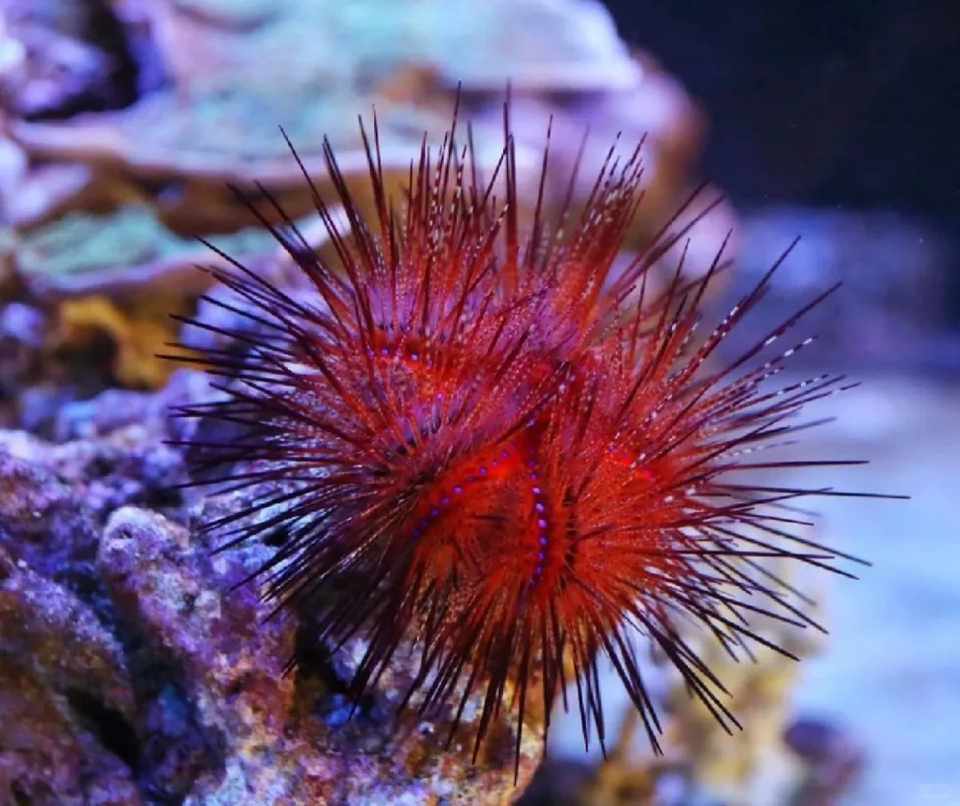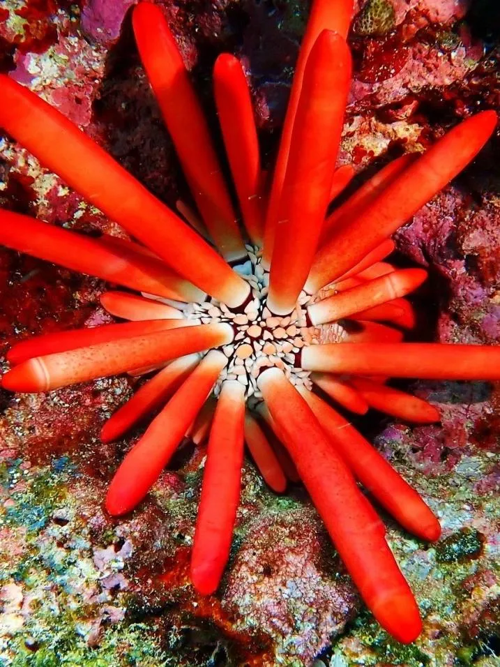 火焰海胆通体火红或橘红,细长的棘刺常带浅色尖端,整体像燃烧的火焰;成体带棘直径可达20–25 厘米;棘刺有剧毒,被刺后会产生剧烈灼痛、红肿,痛感会持续数小时,所以切勿徒手触碰。