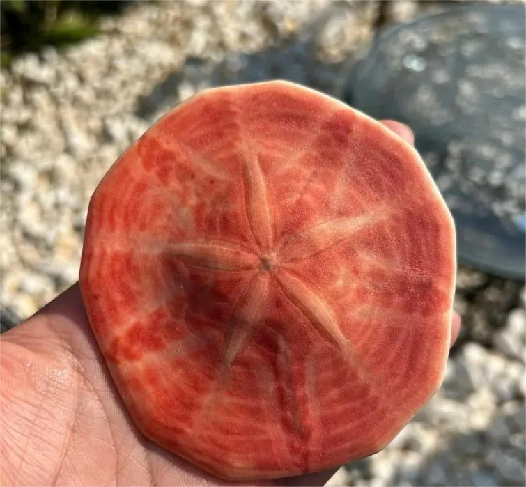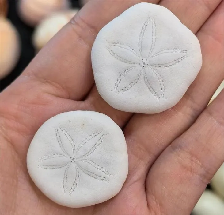 沙钱海胆,属于不规则海胆,呈扁平圆盘状,活体覆盖毛绒般细密短棘,死后绒毛退去会剩下白色钙化硬壳,反口面有标志性的五瓣花纹。