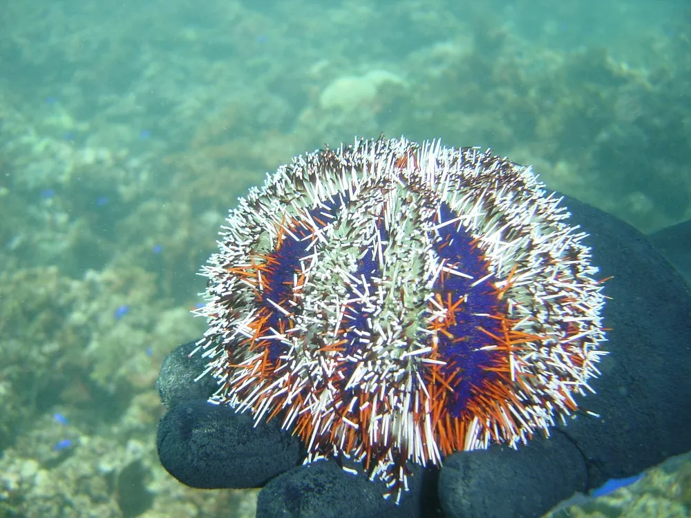 白棘三列海胆,是热带海域典型的剧毒海胆,也是极具辨识度的海胆种类。最显著特征是周身布满白色或淡黄色粗壮长棘,棘刺排成三列。广泛分布于印度——太平洋热带珊瑚礁海域,昼伏夜出,以珊瑚藻、大型海藻等为食。