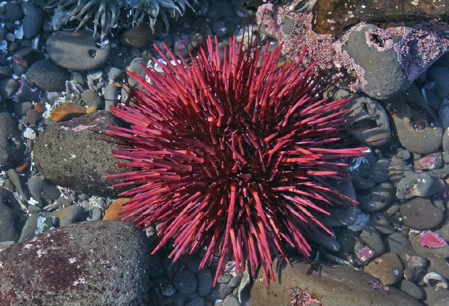 红海胆,也叫巨紫球海胆或加州红海胆,是北太平洋特有的大型冷水食用海胆,壳体呈规整球形,周身布满细长且柔韧的棘刺,通体呈浓郁的深红至酱红色,辨识度极高。最新研究表明,红海胆寿命可超过200年。