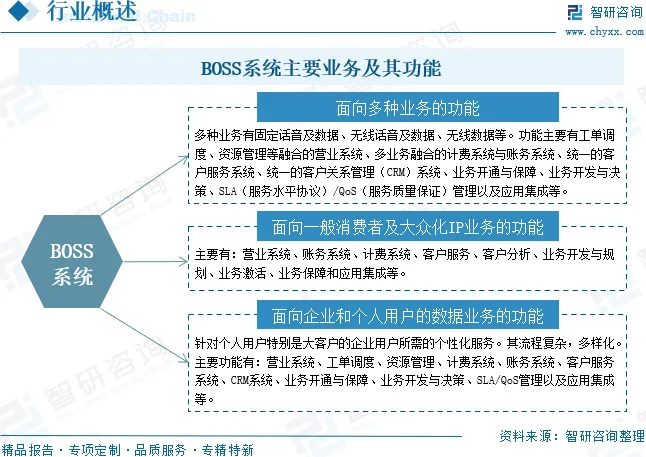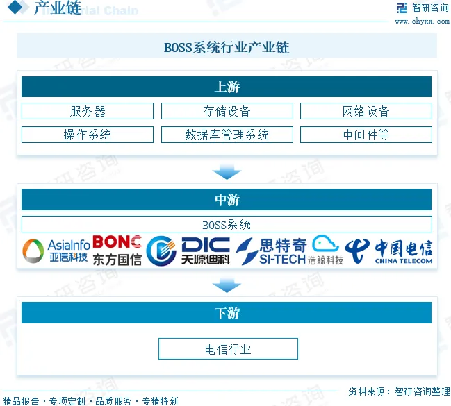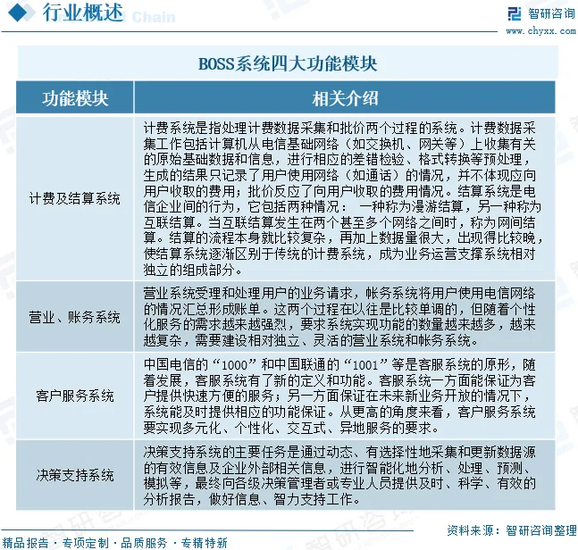 BOSS系统产业链上游包括信息技术硬件制造业和软件开发行业,其中,信息技术硬件制造业提供服务器、存储设备和网络设备等基础设施;软件开发行业提供操作系统、数据库管理系统、中间件等软件平台。产业链中游为BOSS系统服务。产业链下游为应用行业,即电信行业。随着电信市场的竞争加剧和用户需求的多样化,电信运营商需要依赖BOSS系统来实现服务的快速部署、客户关系管理、计费和财务管理等。此外,随着技术的进步,电信运营商开始提供更为复杂的增值服务,如云计算服务、大数据分析服务和物联网服务,这些都需要BOSS系统的支持。