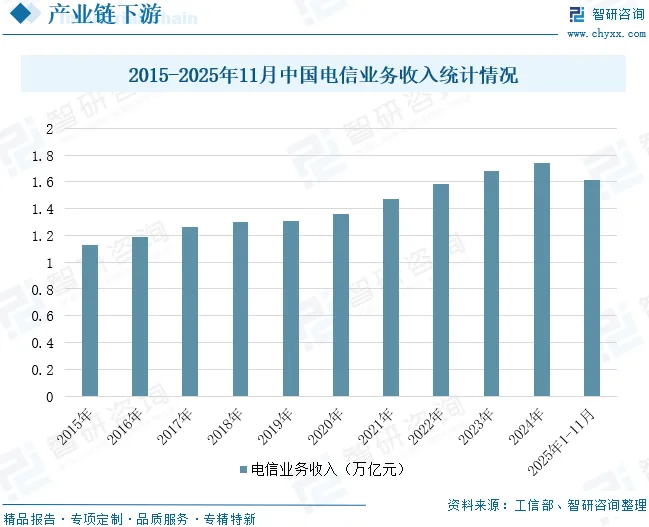 中国电信行业是我国信息技术产业的重要组成部分,也是国计民生的重要领域。随着全球信息技术的不断革新和中国经济的快速发展,中国电信行业进入了一个全新的发展阶段。目前,国家战略鼓励加大数字基础设施建设和数字技术应用的投入,引导新型信息基础设施、数字经济、数据要素市场建设等发展红利释放;同时在中微观视角,政策陆续出台,数据流通使用的堵点难点问题将得到有序解决,数字经济、数实融合将进一步走深走实。另一方面,新一代信息技术加快实现与实体经济的深度融合,不断激发出新的数字化场景创新;基础设施能力和新型信息服务水平不断增强,电信运营企业经营效益不断提升,治理能力增强。工信部数据显示,中国电信业务收入从2015年的1.13万亿元增长至2024年的1.74万亿元,年复合增长率为4.91%。2025年1-11月,中国电信业务收入为1.61万亿元,同比增长0.9%。未来,随着电信业务收入稳健增长,业务革新与数字化转型将推动BOSS系统升级演进。