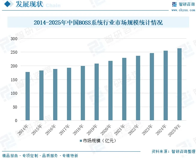 BOSS系统涵盖了电信运营商的业务支撑系统和运营支撑系统,是电信运营商日常运营的重要组成部分。进入5G时代,一方面,物联网将进入大规模商业化阶段,终端数量将爆发式增长;另一方面,运营商大力拓展To B领域业务,计费方式将呈多样化趋势;同时,网络架构的变化,对BOSS系统将产生重大变革,运营商对于BOSS系统的投入也将随之快速增长。当前,随着5G网络的商用化和云服务的普及,BOSS系统正不断地演进升级,尤其在云计算技术的强力驱动下,为市场开辟了崭新的发展空间。数据显示,2014-2024年中国BOSS系统行业市场规模从177.1亿元增长至255.43亿元,年复合增长率为3.73%。2025年中国BOSS系统行业市场规模将增长至264.14亿元。未来,BOSS系统将更加注重数据分析与智能化管理。随着大数据和人工智能技术的应用,BOSS系统将能够更好地分析用户行为,为运营商提供精准的营销策略和客户服务方案。同时,随着云计算技术的发展,BOSS系统将更加灵活和可扩展,能够支持运营商快速响应市场变化,提升整体业务灵活性和竞争力。