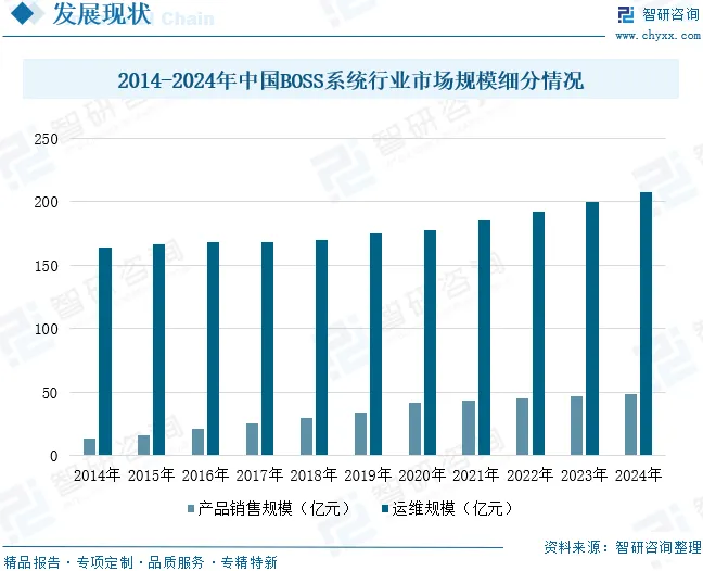 从细分情况来看,中国BOSS系统以运维为主。2024年中国BOSS系统行业市场规模为255.43亿元,其中,BOSS系统产品销售规模为48.3亿元,BOSS系统运维规模为207.1亿元。