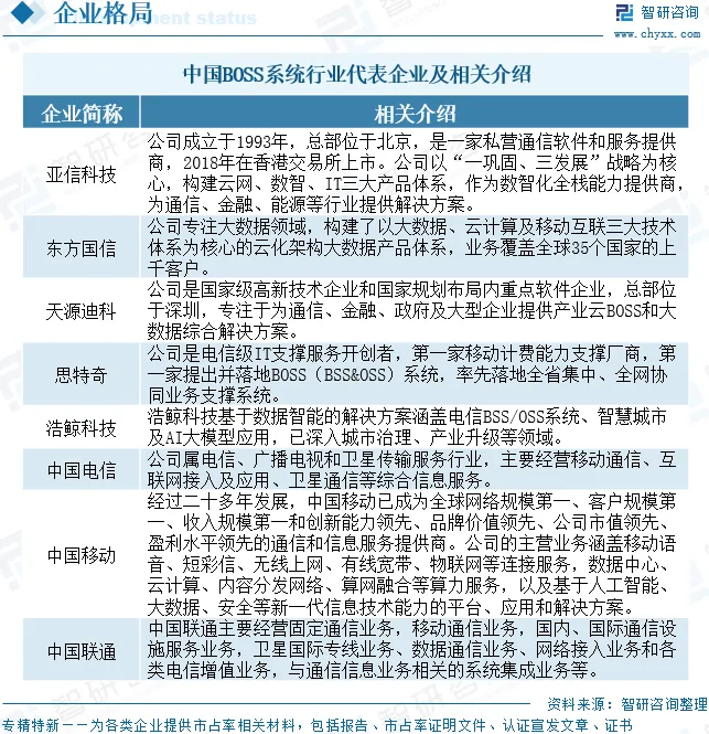 中国BOSS系统行业已形成由专业软件商与电信运营商共同主导的竞争生态。以亚信科技为代表的头部软件企业,凭借在BSS等核心领域的深厚积累与市场份额优势,处于行业引领地位。与此同时,天源迪科、思特奇、浩鲸科技等专业厂商在细分市场或特定解决方案上拥有稳固竞争力。作为主要客户与参与者的三大电信运营商(中国电信、移动、联通),其自身技术力量与内部支撑体系亦构成市场的重要组成部分。整体格局呈现出龙头引领、专业化分工与运营商深度参与的多元化特征,竞争焦点正从传统系统集成向云化、数据智能与业务敏捷创新全面升级。