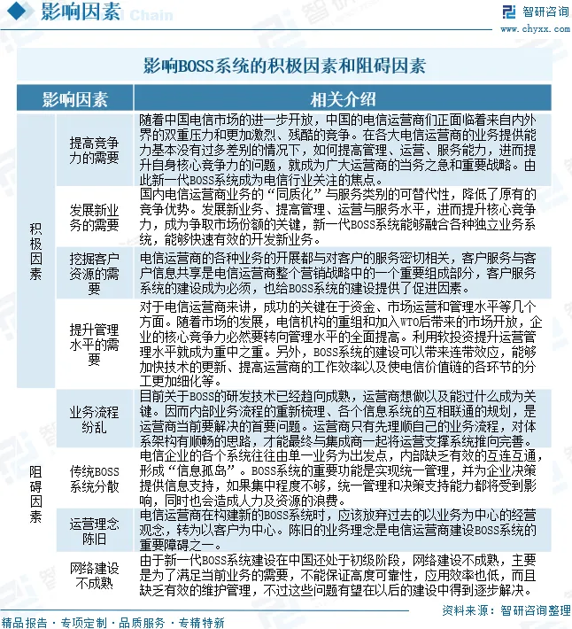 影响BOSS系统的积极因素包括:(1)提高竞争力的需要;(2)发展新业务的需要;(3)挖掘客户资源的需要;(4)提升管理水平的需要。影响BOSS系统的阻碍因素包括:(1)业务流程纷乱;(2)传统BOSS系统分散;(3)运营理念陈旧;(4)网络建设不成熟。