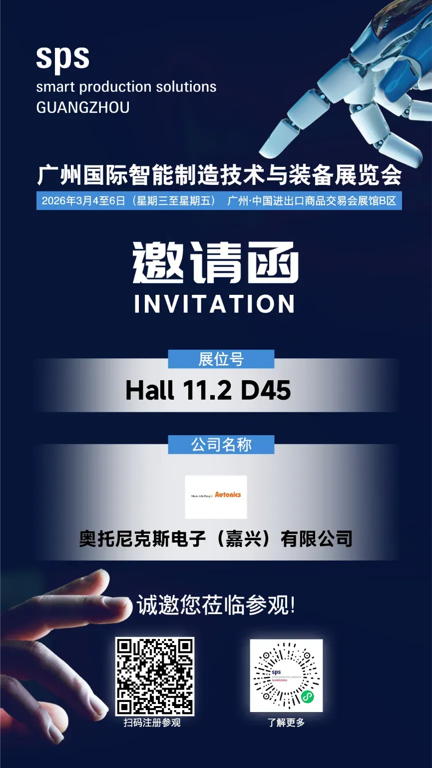 开春第一展,锁定2026 SPS广州国际智能制造技术与装备展览会。3月4-6日,奥托尼克斯携工业自动化全矩阵产品亮相中国进出口商品交易会展馆B区(广州)11.2D45展位。智能传感、精密控制、高速互联——我们用创新自动化方案回应智造升级的每一个目标,作为行业的佼佼者,诚挚地邀请您一同走进这场科技盛宴,共同见证智能制造的无限可能!