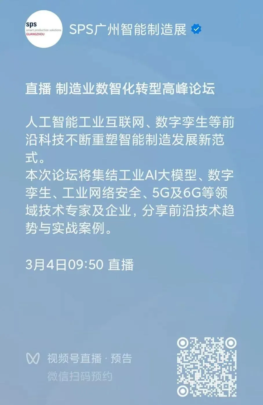 广州国际智能制造技术与装备展览会(SPS – Smart Production Solutions Guangzhou)将于下周3月4至6日在中国进出口商品交易会展馆B区盛大举行。本届展会亮点包括智创未来展区、初创企业专区等特色展区,并规划13场高品质同期活动,聚焦AI大模型、数字孪生、工业网络安全和具身智能等行业热点。通过多元化的场景展示与专业内容分享,展会将为华南智能制造领域搭建创新展示、技术交流与资源对接的综合平台,为产业数智化转型提供支撑。