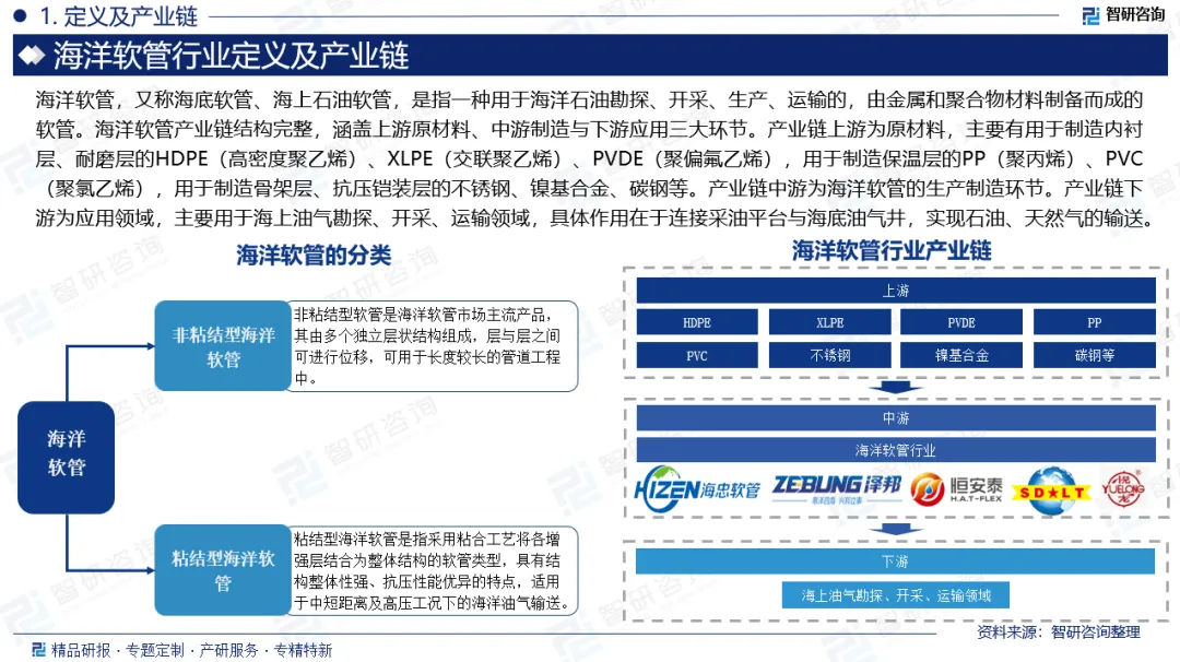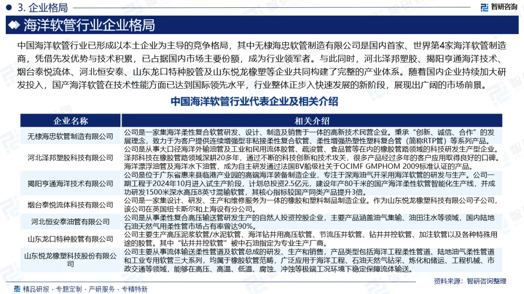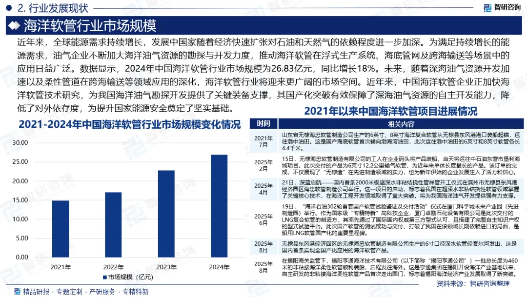 海洋软管,又称海底软管、海上石油软管,是指一种用于海洋石油勘探、开采、生产、运输的,由金属和聚合物材料制备而成的软管。海底管道是海上油气田的生命线,海洋软管作为海底管道的一种型式,主要用于海上石油勘探、开采、运输领域,具体作用在于连接采油平台与海底油气井,实现石油、天然气的输送。根据制造工艺不同,海洋软管主要分为非粘结型海洋软管和粘结型海洋软管,其中,非粘结型软管是海洋软管市场主流产品,其由多个独立层状结构组成,层与层之间可进行位移,可用于长度较长的管道工程中。在海洋油气开采体系中,海底管道是连接海底油井与陆地终端的关键基础设施,其运行稳定性直接关乎能源输送安全。由于长期处于高压、低温、强腐蚀及复杂地质活动的深海环境中,传统钢质管道面临严峻挑战。海洋软管凭借其独特的柔性结构、卓越的耐腐蚀性与耐高低温性能,能够在恶劣工况下保持长期稳定运行,已成为深海油气输送的“海底生命线”。海洋软管核心技术曾长期被国外垄断,直至2010年无棣海忠软管制造有限公司成功研发出首根国产海洋软管并应用于南海西部海域,才实现国产化突破。近年来,全球能源需求持续增长,发展中国家随着经济快速扩张对石油和天然气的依赖程度进一步加深。为满足持续增长的能源需求,油气企业不断加大海洋油气资源的勘探与开发力度,推动海洋软管在浮式生产系统、海底管网及跨海输送等场景中的应用日益广泛。数据显示,2024年中国海洋软管行业市场规模为26.83亿元,同比增长18%。未来,随着深海油气资源开发加速以及柔性管道在跨海输送等领域应用的深化,海洋软管行业将迎来更广阔的市场空间。中国海洋软管行业已形成以本土企业为主导的竞争格局,其中无棣海忠软管制造有限公司是国内首家、世界第4家海洋软管制造商,凭借先发优势与技术积累,已占据国内市场主要份额,成为行业领军者。与此同时,河北泽邦塑胶、揭阳亨通海洋技术、烟台泰悦流体、河北恒安泰、山东龙口特种胶管及山东悦龙橡塑等企业共同构建了完整的产业体系。随着国内企业持续加大研发投入,国产海洋软管在技术性能方面已达到国际领先水平,行业整体正步入快速发展的新阶段,展现出广阔的市场前景。此外,漯河利通液压科技股份有限公司也在积极开展海洋软管业务,2025上半年,公司API 17K海洋石油管产线设备已陆续到货安装,目前正在有序推进海洋石油软管产线的建设,预计2025年Q4完成产线建设和试产工作。