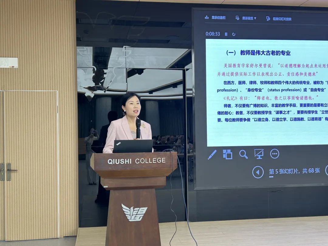 浙大蓝田学园副书记、主任包松老师为我们讲解了新时代教师的礼仪要求与行为规范,她用幽默风趣的语言以及鲜明生动的例子,让我们对教师形象有了新的认识与理解。